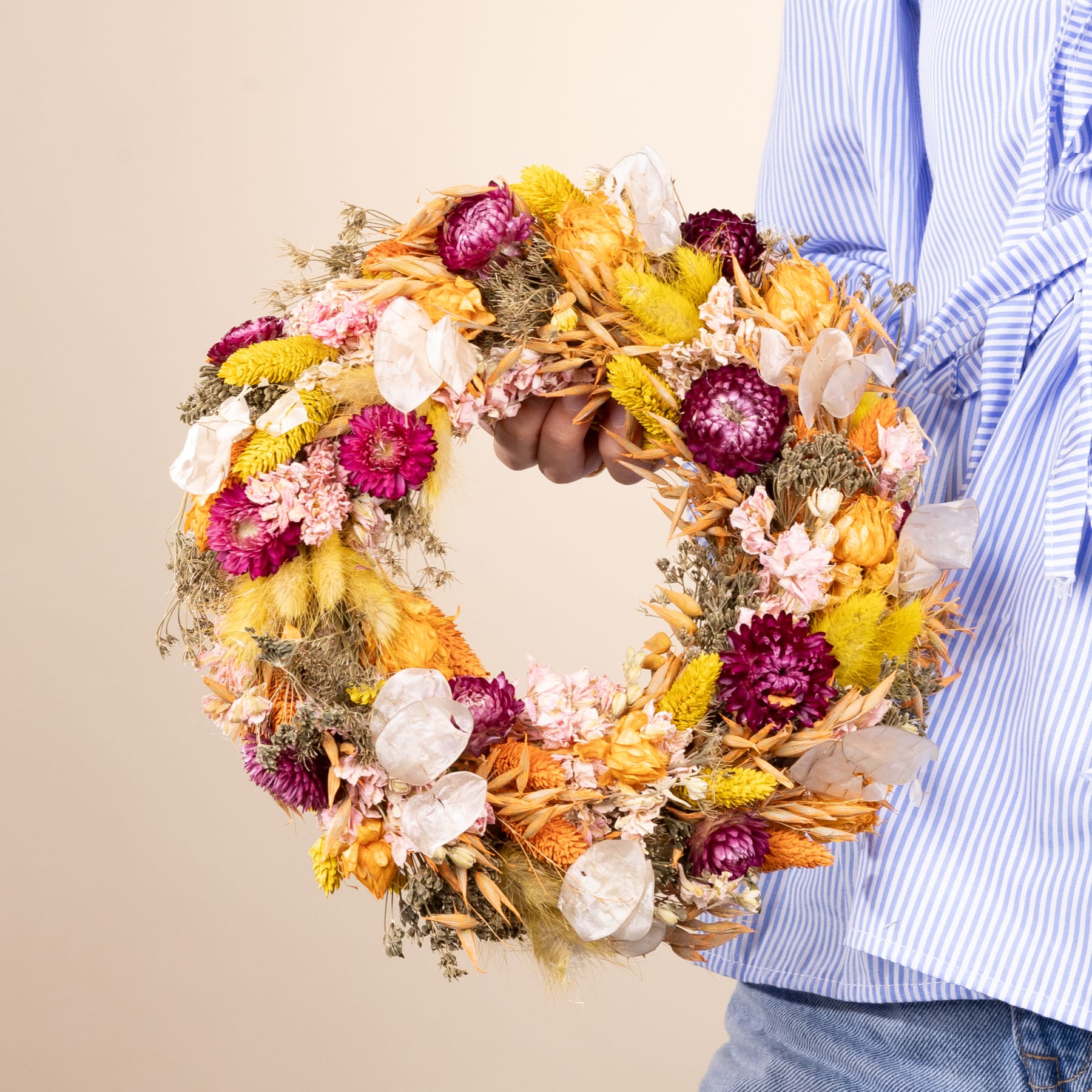 Verschenke Freude und Sommerzauber mit dem Trockenblumenkranz Sunshine Orange! Mit einem Durchmesser von 25 cm bringt dieser fröhliche Kranz leuchtende Farben in jedes Zuhause. Natürliche pinke Strohblumen, rosafarbener Rittersporn, gelbe Phalaris und flauschiger Lagurus vereinen sich mit einer Auswahl an orangefarbenen Trockenblumen und edlem Silberblatt zu einem harmonischen Gesamtbild. Ob als Tischdekoration oder Türkranz – der Trockenblumenkranz Sunshine Orange ist ein zeitloses Geschenk, das stets an deine Liebe und Wertschätzung erinnert. Die Trockenblumen sind ewig schön, doch beachte bitte, dass sie durch Sonneneinstrahlung verblassen können. Verschenke diesen bezaubernden Kranz an deine Liebsten und bringe ein Stück Sommer in das Leben deiner Lieben!