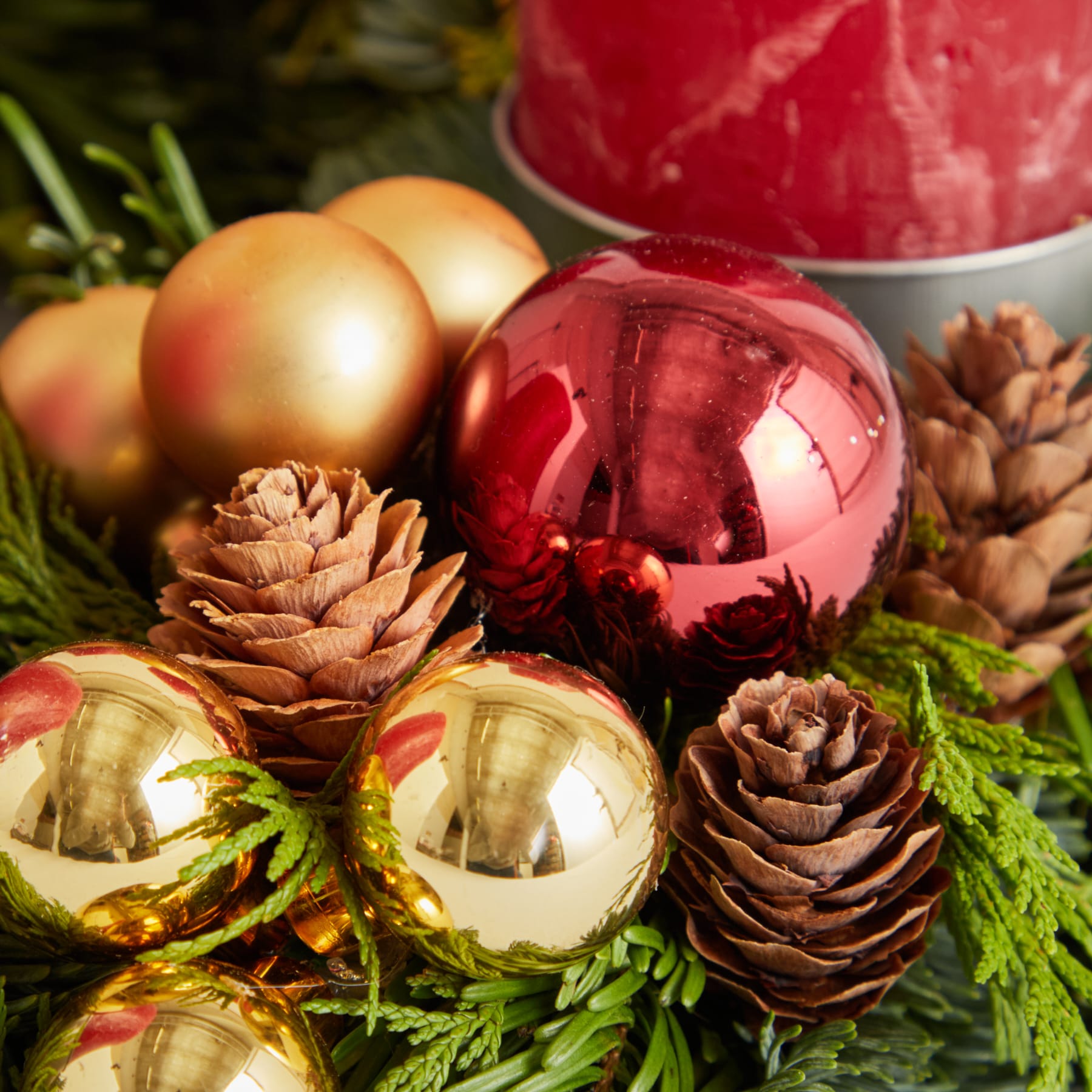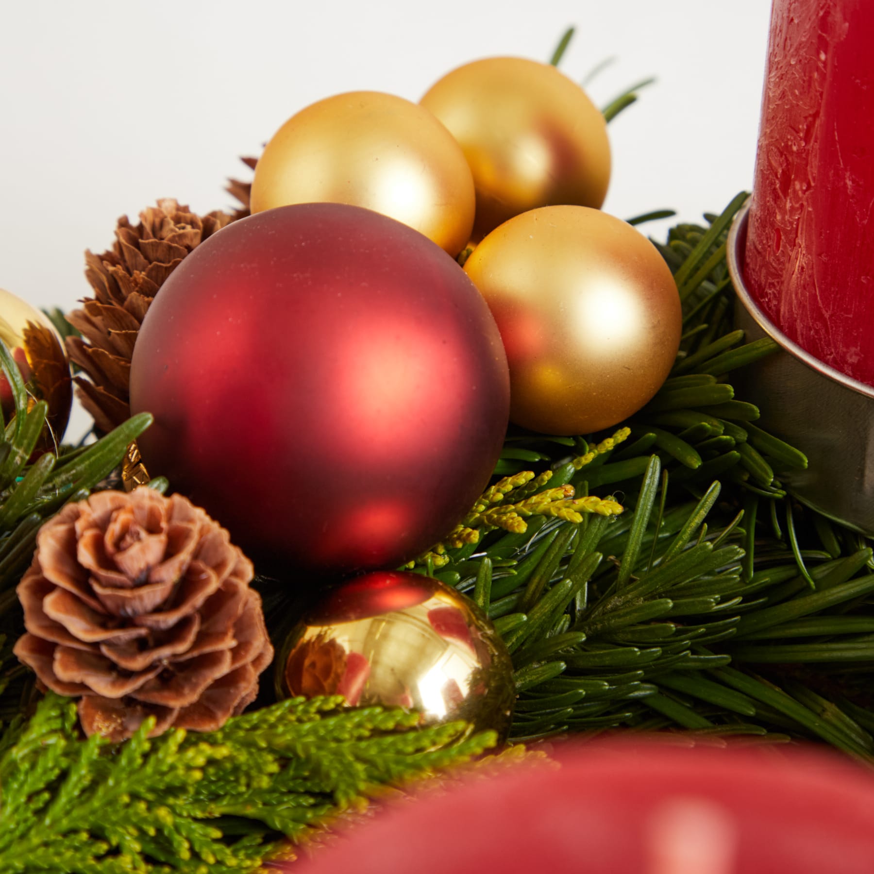 Ein Kranz wie eine Umarmung: Dezemberliebe vereint edle Deko in Gold und Kupfer mit warmen Kerzen auf frischem Nobilis- und Koniferengrün. Der klassische Stil und die sanfte Farbgebung schaffen ein harmonisches Gesamtbild, das Geborgenheit ausstrahlt. Ideal als festliches Highlight oder als liebevolles Geschenk – Dezemberliebe bringt Glanz, Duft und Wärme in die Adventszeit und lässt Herzen ein kleines bisschen heller leuchten.