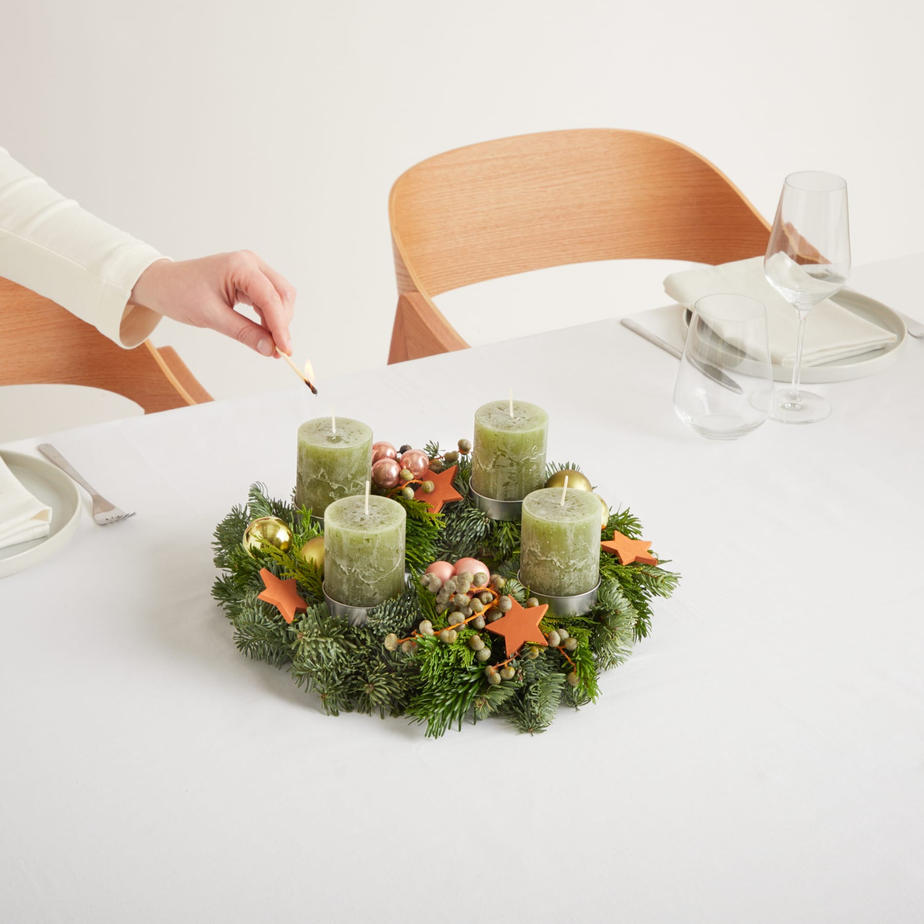 Mit unserem Adventskranz Tannentraum zieht winterlicher Zauber in jedes Zuhause ein. Der geschmückte Kranz aus Nobilis- und Koniferengrün mit grünen Kerzen und harmonischer Deko verströmt festliche Ruhe und natürliche Eleganz. Ideal für moderne Weihnachtsliebhaber:, die sanfte Farben und dezente Akzente schätzen. Ob als Geschenk oder als stilvolle Tischdeko – der Kranz Tannentraum bringt den Duft von Wald, Wärme und Kerzenschein in die Adventszeit.