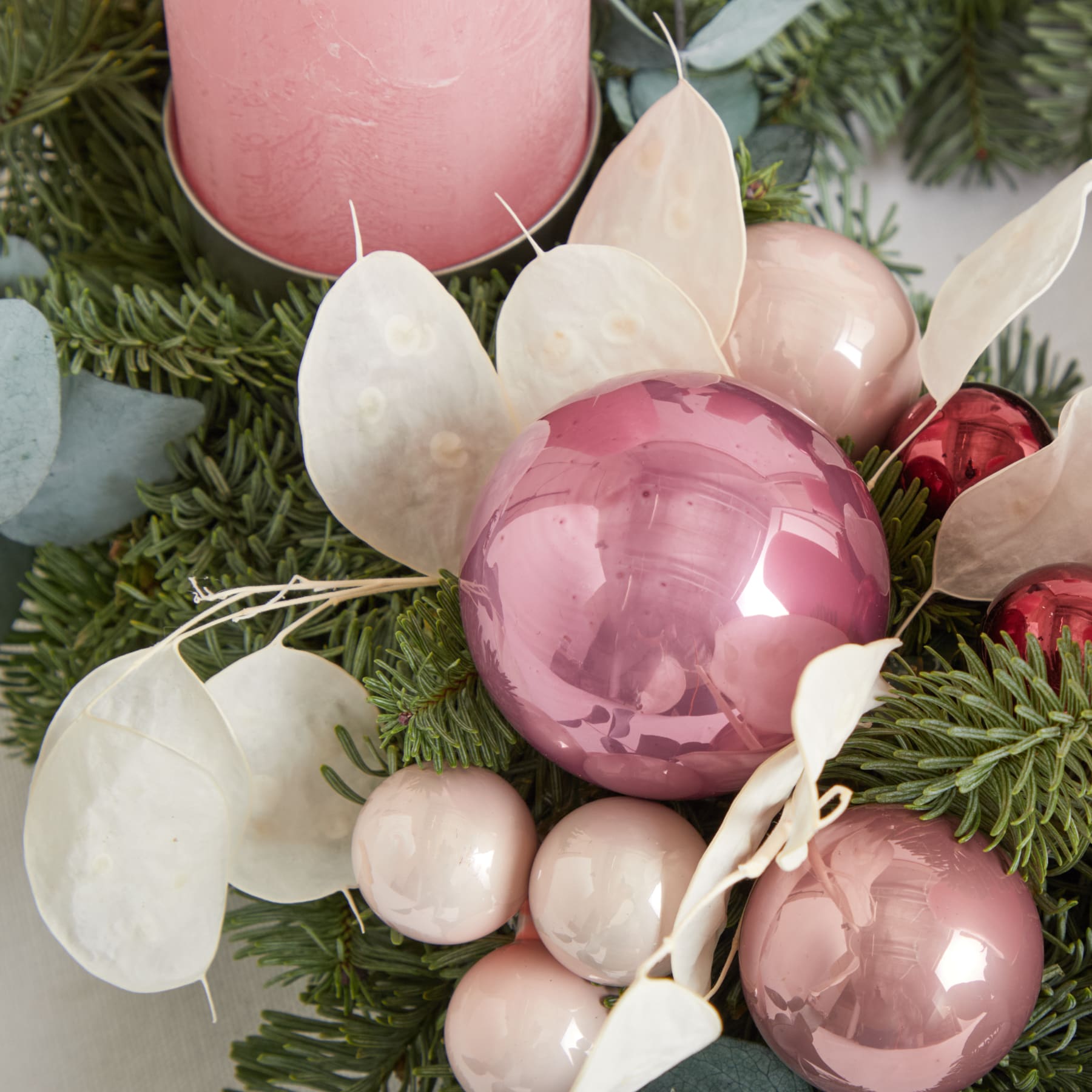 Ein Hauch von Rosé, ein Schimmer von Schnee – Unser Adventskranz Pink December ist der Inbegriff moderner Weihnachtsromantik. Zarte rosa Kerzen und helle Deko auf frischer Nordmanntanne und Eukalyptus machen diesen Premium-Adventskranz zu einem stilvollen Highlight. Ideal für alle, die es edel und einzigartig mögen. Als Geschenk zaubert er Lächeln und Leichtigkeit in den Advent – und verwandelt jedes Zuhause in eine kleine Winterpoesie.