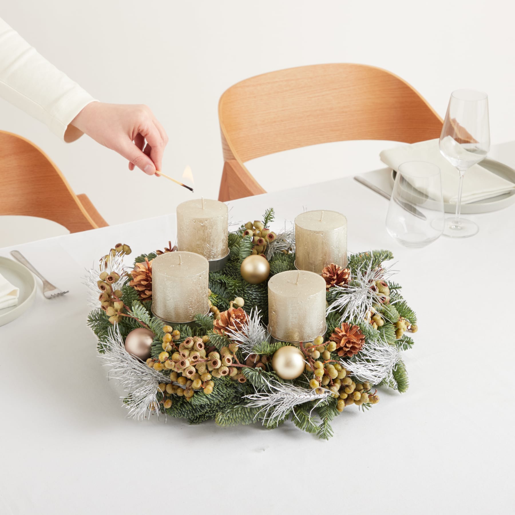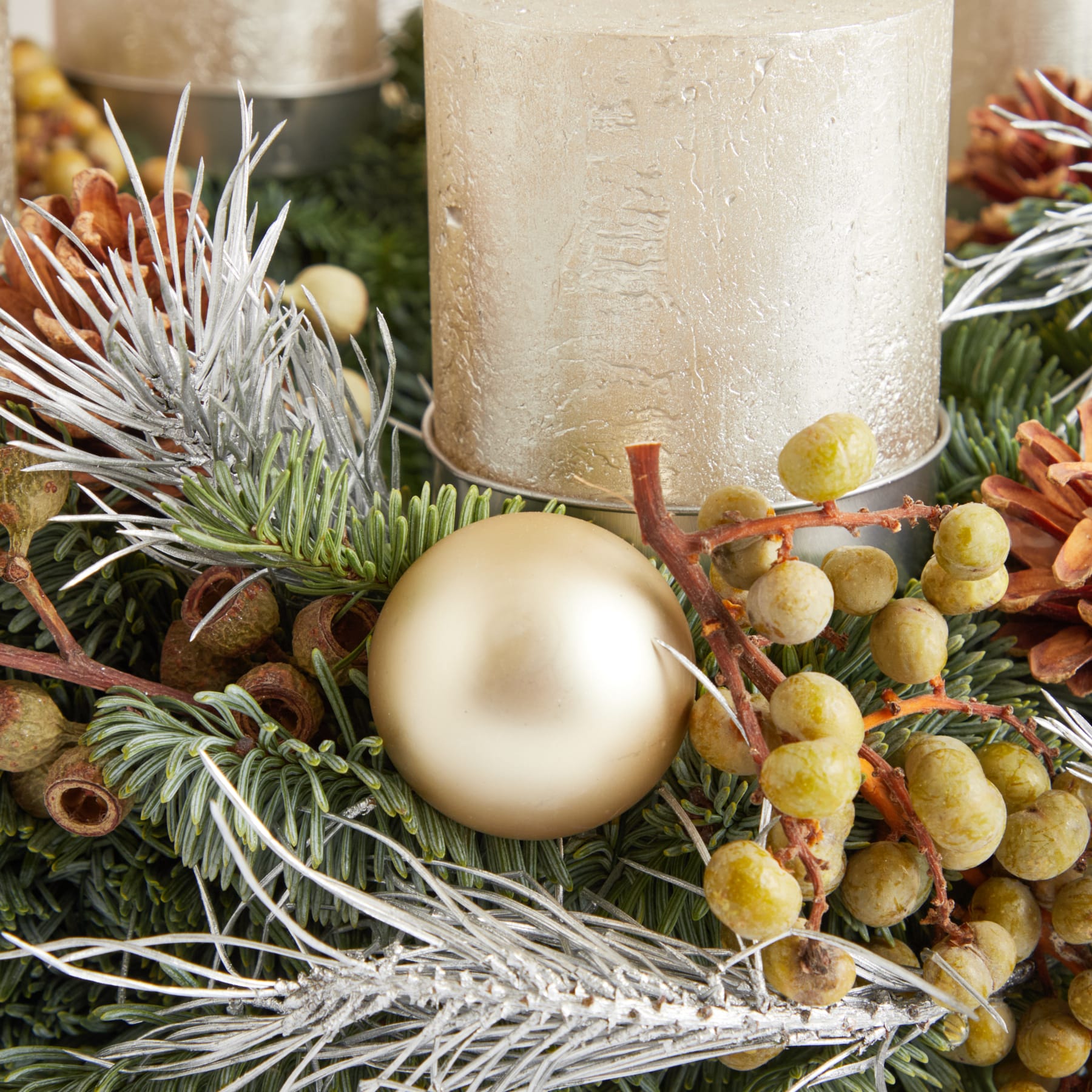 Glanzvoll und elegant – unser Adventskranz Silberfunken lässt die Adventszeit funkeln. Cremefarbene Kerzen und silber-goldene Highlights schmücken den Kranz aus frischer Nordmanntanne zu einem echten Premium-Schmuckstück. Sein edler Stil verleiht jedem Raum festliche Leichtigkeit. Perfekt als luxuriöses Geschenk oder für die eigene Weihnachtsstube – der geschmückte Kranz Silberfunken bringt Glanz, Wärme und ein Hauch Wintermagie ins Zuhause.