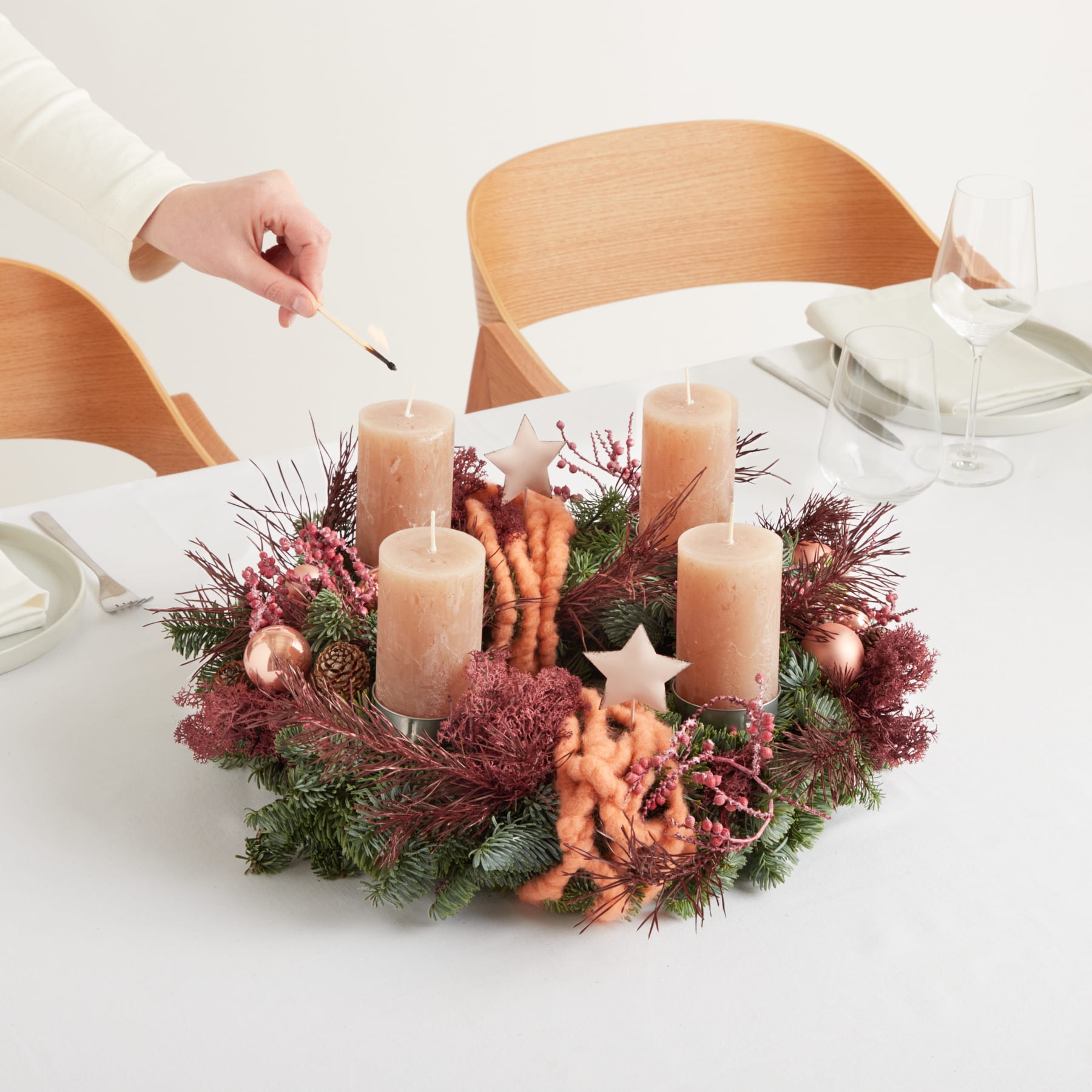 Modern, edel und stilvoll – der Premium-Adventskranz Winter Aesthetic verleiht der Adventszeit einen Hauch von Eleganz. Apricotfarbene Kerzen harmonieren perfekt mit der dunkelroten und apricotfarbenen Deko auf frischem Nobilisgrün. Der moderne Stil schafft ein ausgewogenes Zusammenspiel aus Natürlichkeit und Design. Ideal als Geschenk für Lieblingsmenschen zur besinnlichen Vorweihnachtszeit. Unser Adventskranz Winter Aesthetic vereint Wärme, Stil und festliche Stimmung – ein Kranz für alle, die Weihnachten mit einem modernen Twist lieben. Der Durchmesser beträgt ca. 35 cm