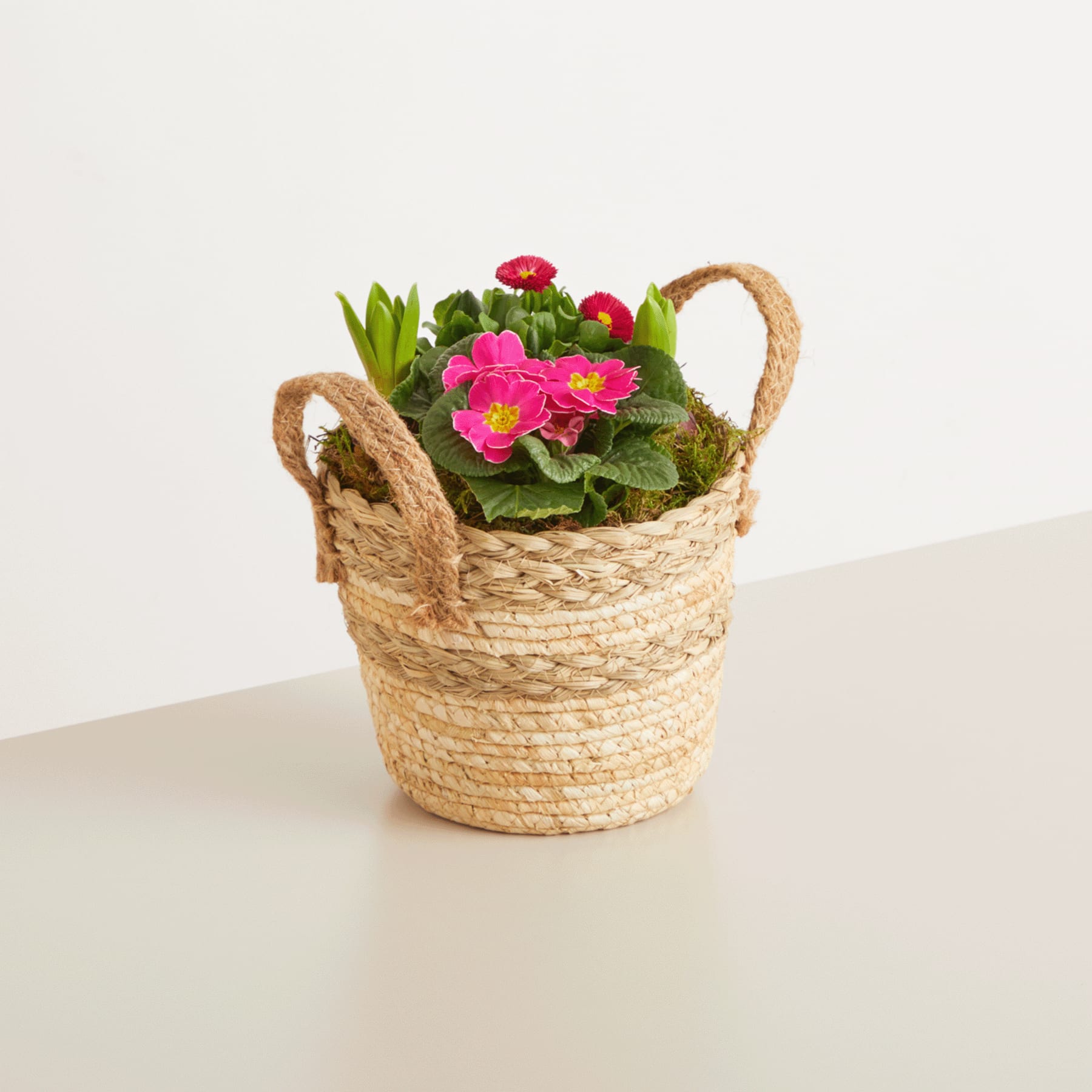 Jep, es ist geschafft. Wir haben das triste Wintergrau hinter uns gelassen und können uns nun an den ersten Blumen des Frühlings erfreuen! Wie wäre es, wenn du diese Freude mit deinen Lieblingsmenschen teilst? Unser Pflanzenarrangement Frühlingsflirt ist ein echter Stimmungskick! Der hübsche Korb mit zwei Henkeln enthält Hyazinthen, eine Primel und niedliche Bellis. Alle Pflanzen sind winterhart und verkraften auch kalte Frühlingsnächte im Freien. Die Wuchshöhe beträgt etwa 26 cm, die Topfgröße liegt bei 20 cm. Gönne Hyazinthen und Primel später einen Platz in deinem Garten. Als Zwiebelblumen begeistern die Hyazinthen jedes Frühjahr erneut mit ihrer langlebigen Blütenpracht und auch die hübsche Primel ist mehrjährig.