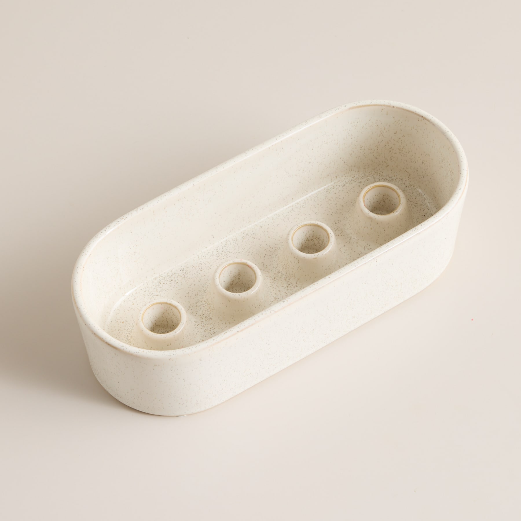 Schlicht, aber alles andere als langweilig: Dieses längliche Kerzentablett aus Keramik kombiniert klare Formen mit einem modernen Sprenkel-Look. Die glänzende Glasur in Weiß wird durch feine grau-braune Sprenkel aufgelockert – ein echter Hingucker für jede Jahreszeit. Mit einer Breite von 11,5 cm und einer Höhe von 7 cm bietet das Tablett Platz für vier Kerzen und lässt sich nach Lust und Laune dekorieren – ob minimalistisch oder mit Tannengrün, Trockenblumen oder kleinen Figuren. Ideal für den Esstisch, das Sideboard oder als moderner Adventskranz. Dieses Kerzentablett bringt stilvolle Gemütlichkeit in dein Zuhause – ganz ohne viel Schnickschnack, aber mit viel Charme.