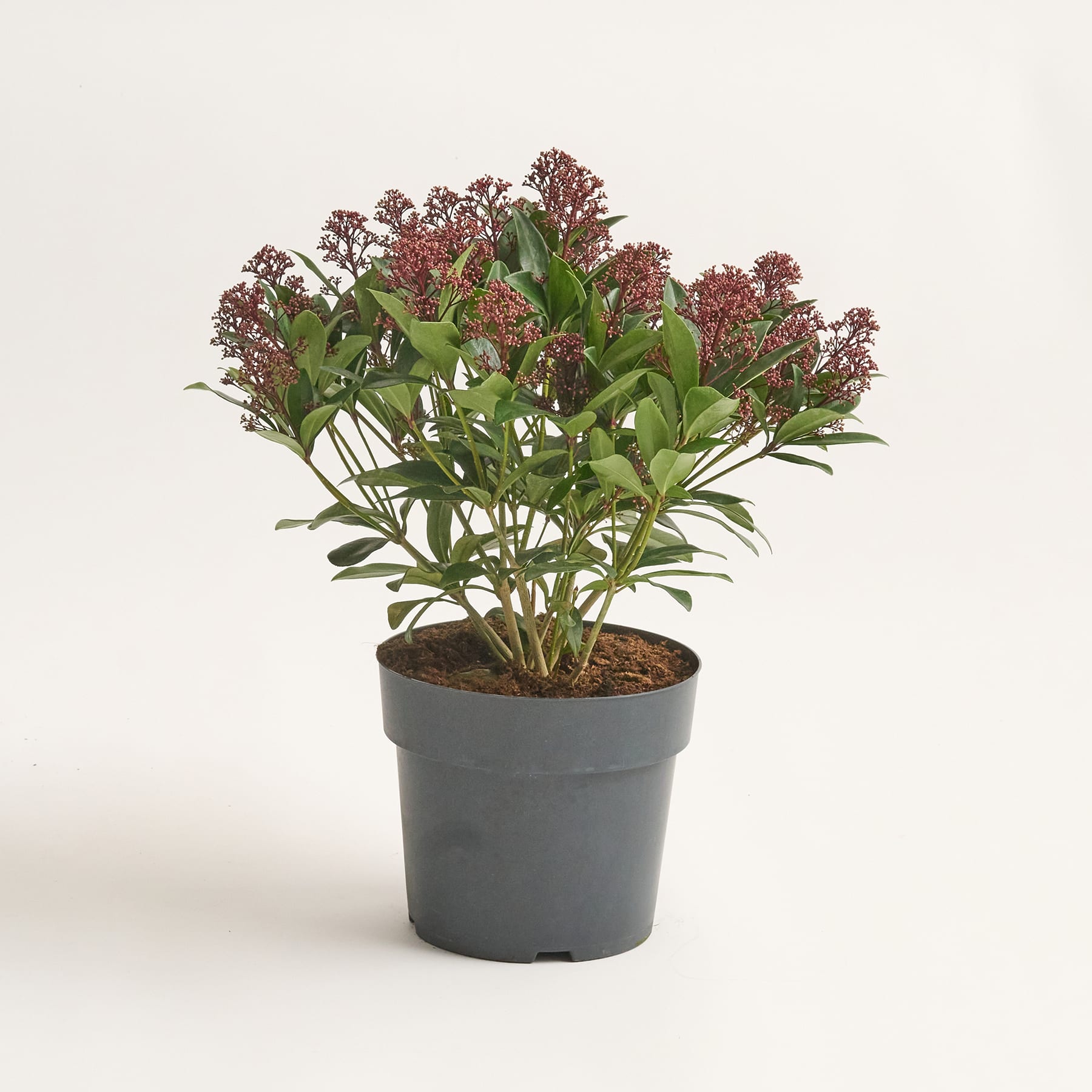 Kompakt, charmant und voller Überraschungen: Die Skimmie 'Finchy®' bringt je nach Zufall ihre Blütenknospen in Rot oder Weiß hervor. Die glänzend grünen Blätter der Skimmia japonica bilden den perfekten Hintergrund für die dekorativen Knospen, die den Winter über Farbe ins Beet oder auf den Balkon bringen. Sie liebt halbschattige bis schattige Standorte und gedeiht in humosem, leicht saurem Boden. Der Wasserbedarf ist mäßig – der Wurzelballen sollte nie völlig austrocknen. Die Skimmie 'Finchy®' ist nicht nur pflegeleicht, sondern auch bienenfreundlich. Die Skimmie 'Finchy®' ist in verschiedenen Farben erhältlich, wir überraschen dich mit einer Zufallsfarbe - sei gespannt! Ihre Kombination aus immergrünem Laub und langlebiger Knospenpracht macht sie zu einem wertvollen Schmuckstück für die kalte Jahreszeit.