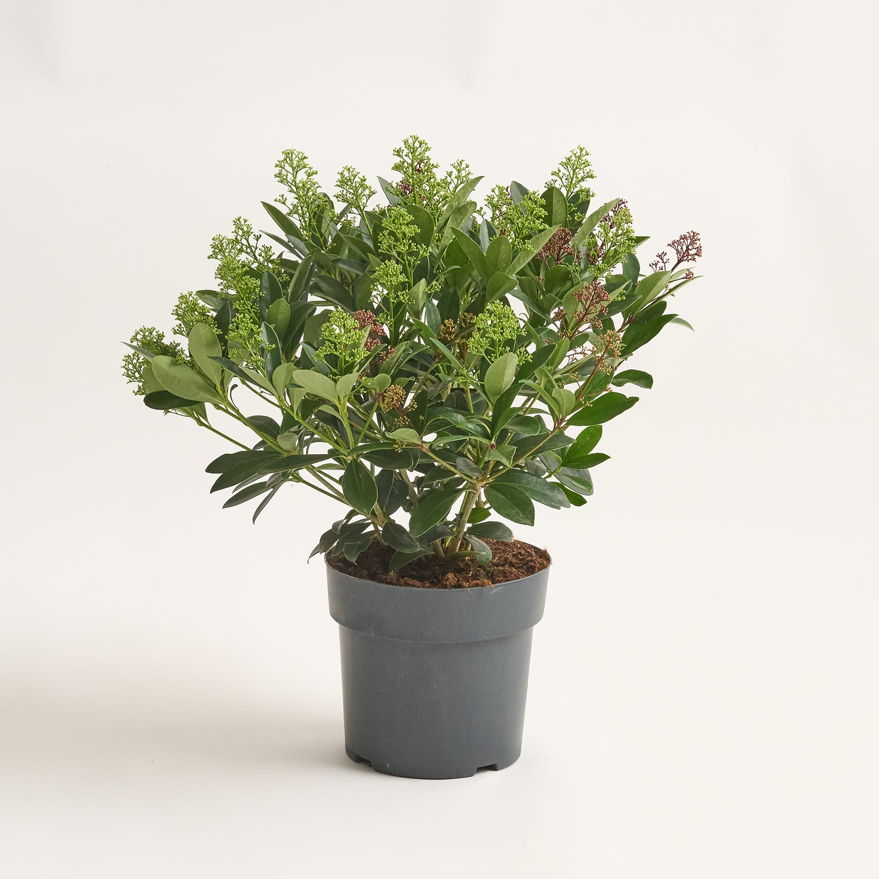 Ein Farbspiel wie gemalt: Die zweifarbige Skimmie 'Mica Finchy Fantasy' begeistert mit Knospen in leuchtendem Rot und Cremeweiß, eingebettet in sattgrünes Laub. Die Skimmia japonica liebt halbschattige bis schattige Standorte und gedeiht am besten in humosem, leicht saurem Boden. Ihr Wasserbedarf ist moderat, wobei der Boden stets leicht feucht bleiben sollte. Diese Skimmie ist ein wahrer Hingucker im Wintergarten, auf der Terrasse oder im Kübel. Ihre zweifarbige Knospenpracht sorgt von Herbst bis ins Frühjahr für Abwechslung und Eleganz. Pflegeleicht und robust bringt sie Farbe in die kältesten Monate und verleiht jedem Pflanzarrangement eine besondere Note.