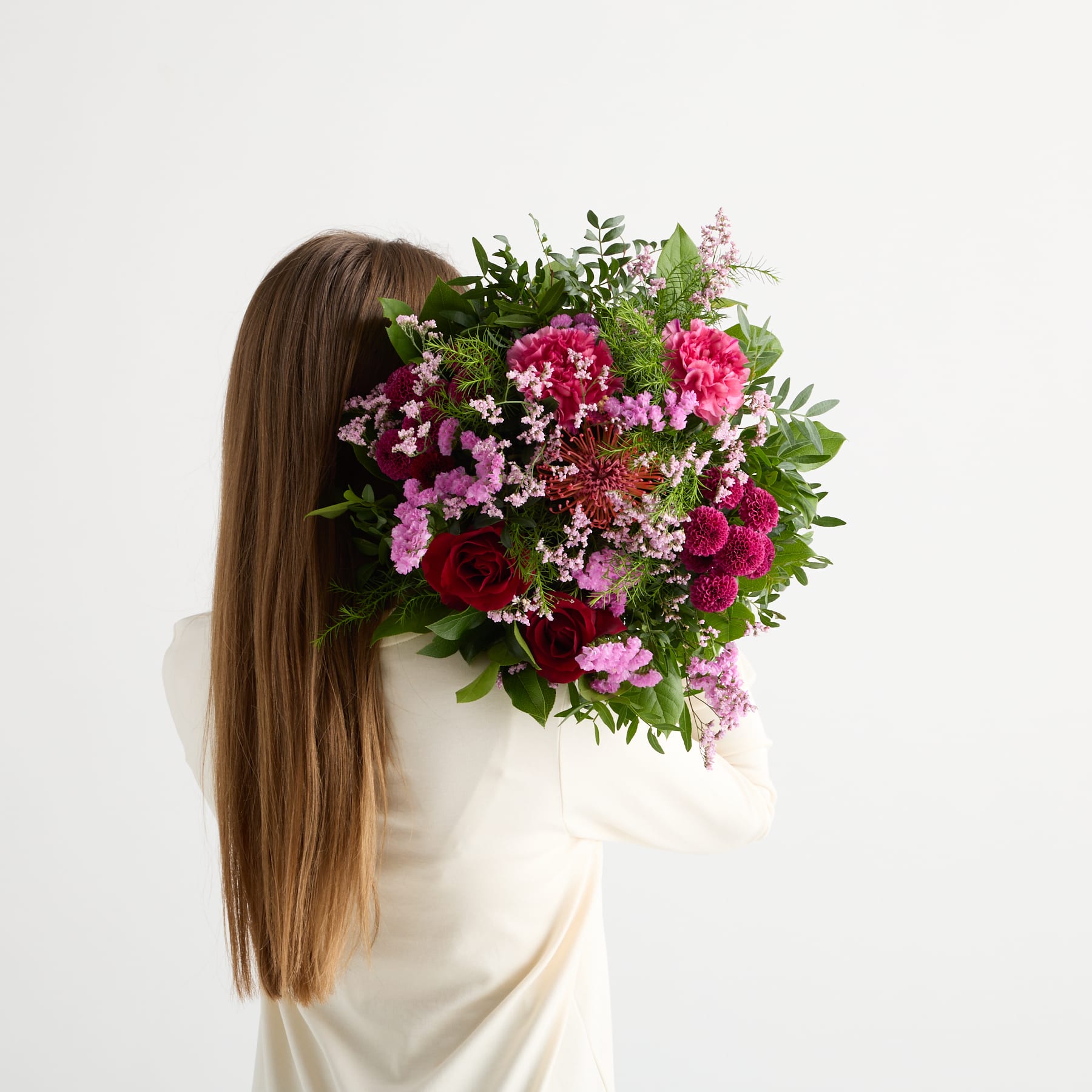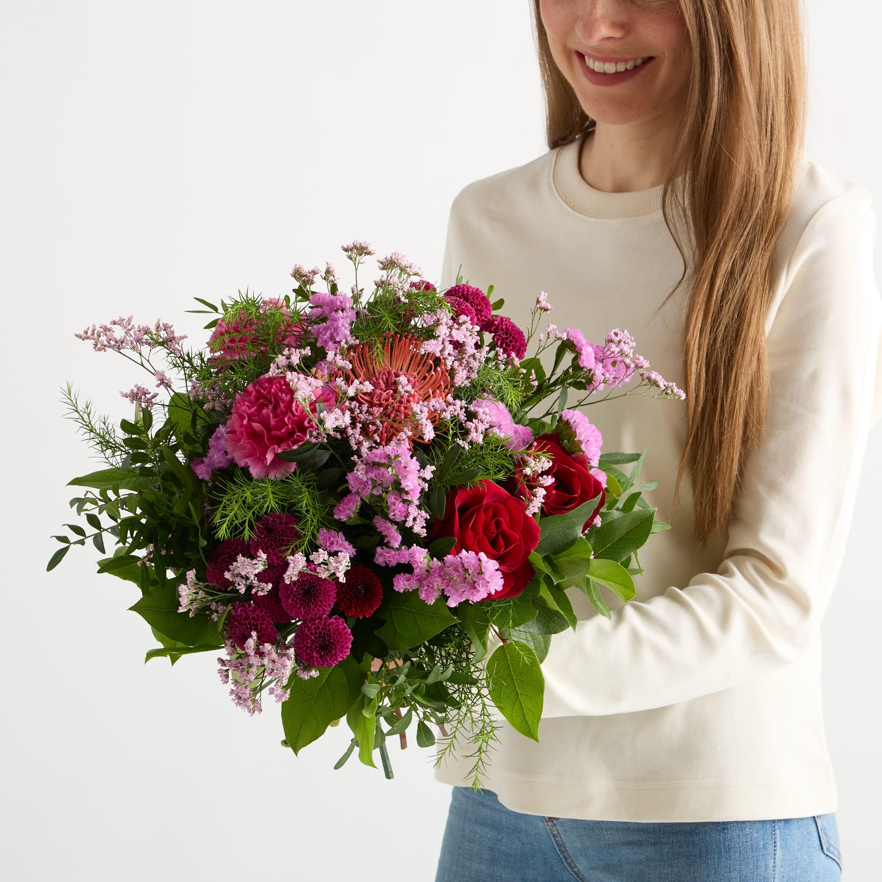 Holiday Harmony – ein festlicher Blumenstrauß, der die Wärme und Geborgenheit der Weihnachtszeit einfängt. Leuchtende Rosen und Nelken vereinen sich mit zarten Chrysanthemen zu einem harmonischen Farbenspiel, das Herz und Seele berührt. Die außergewöhnliche Nadelkissen-Protea setzt eindrucksvolle Akzente, während Sicheltanne, Pistazie und Salal den Strauß in ein sanft duftendes Winterkleid hüllen. Feines Limonium verleiht ihm einen Hauch Leichtigkeit – wie glitzernder Raureif im Morgenlicht. Mit Holiday Harmony verschenkst du mehr als Blumen – du schenkst ein Gefühl von Nähe, Freude und festlicher Ruhe. Ein liebevoller Gruß für Menschen, die dir am Herzen liegen, und ein zauberhafter Begleiter durch die schönste Zeit des Jahres.