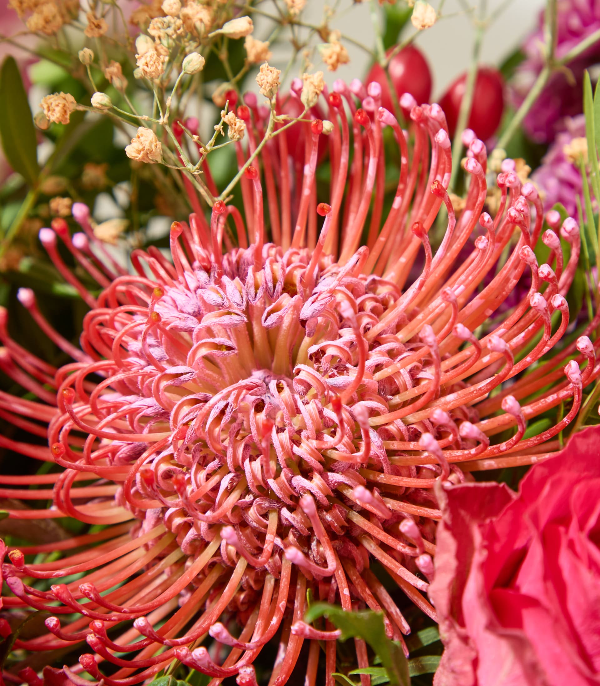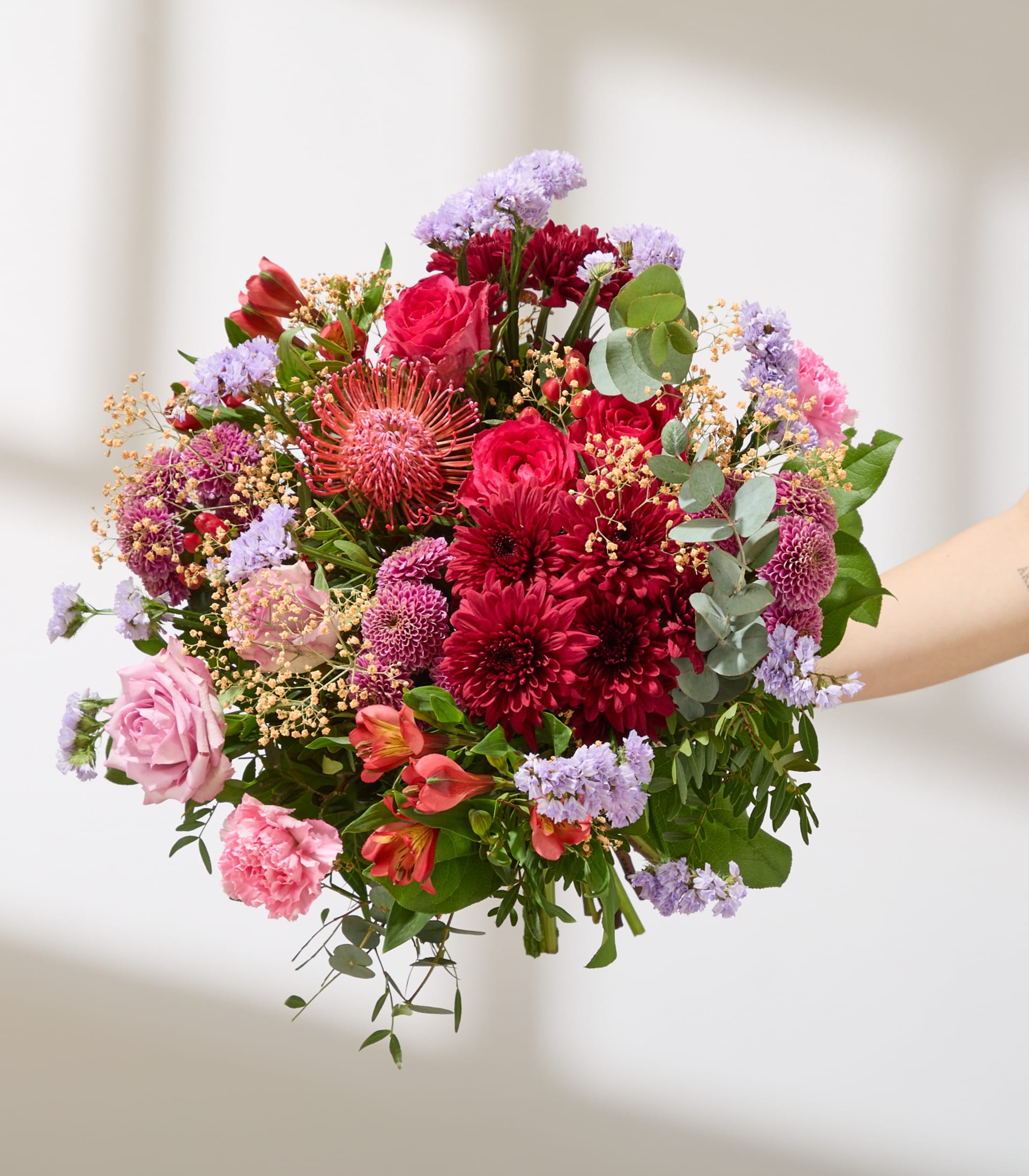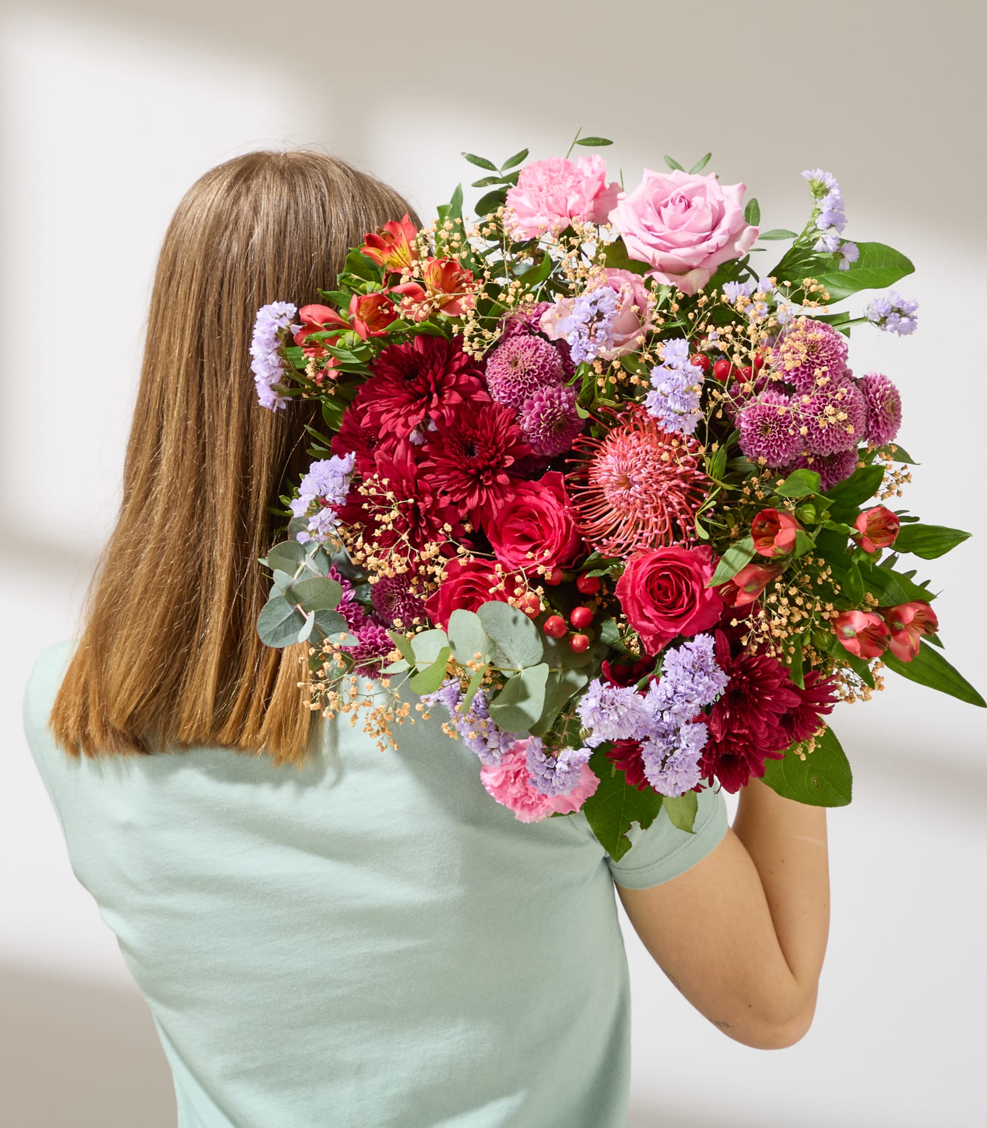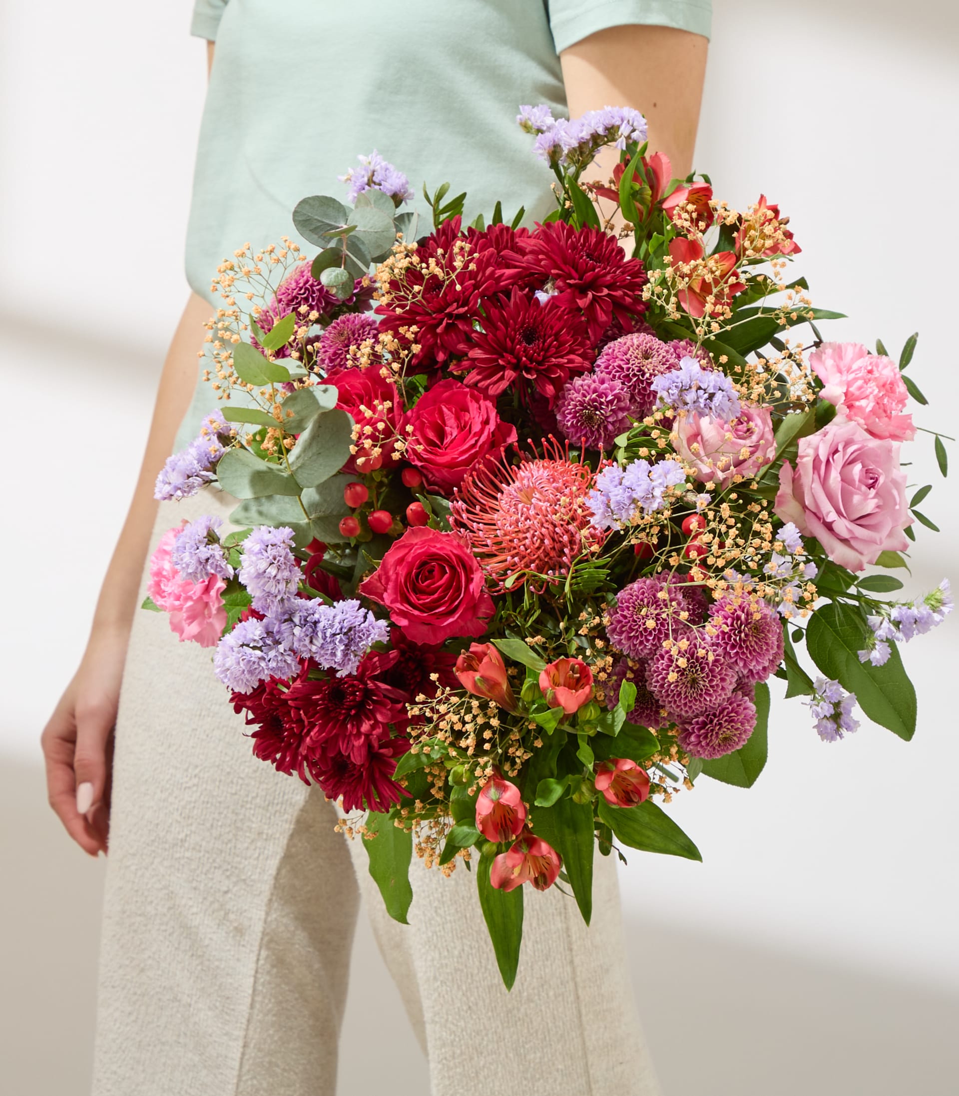 Bunt, lebendig und voller Energie – dieser Strauß ist ein echtes Farbversprechen. Im Fokus stehen Rosen, die seit Jahrhunderten als Königinnen der Blumen gelten. Jede Farbe erzählt ihre eigene Geschichte und bringt Emotionen zum Ausdruck. Umgeben von Alstromerien, Nelken und Chrysanthemen entfalten sie ihre volle Wirkung. Eukalyptus und Johanniskraut sorgen für moderne Frische, während Limonium und Schleierkraut das Arrangement sanft abrunden. Mit einem Durchmesser von ca. 40 cm ist der Blumenstrauß Happy Color ein ausdrucksstarker Frühlingsgruß. Ein Strauß, der zeigt: Gute Laune lässt sich verschenken.