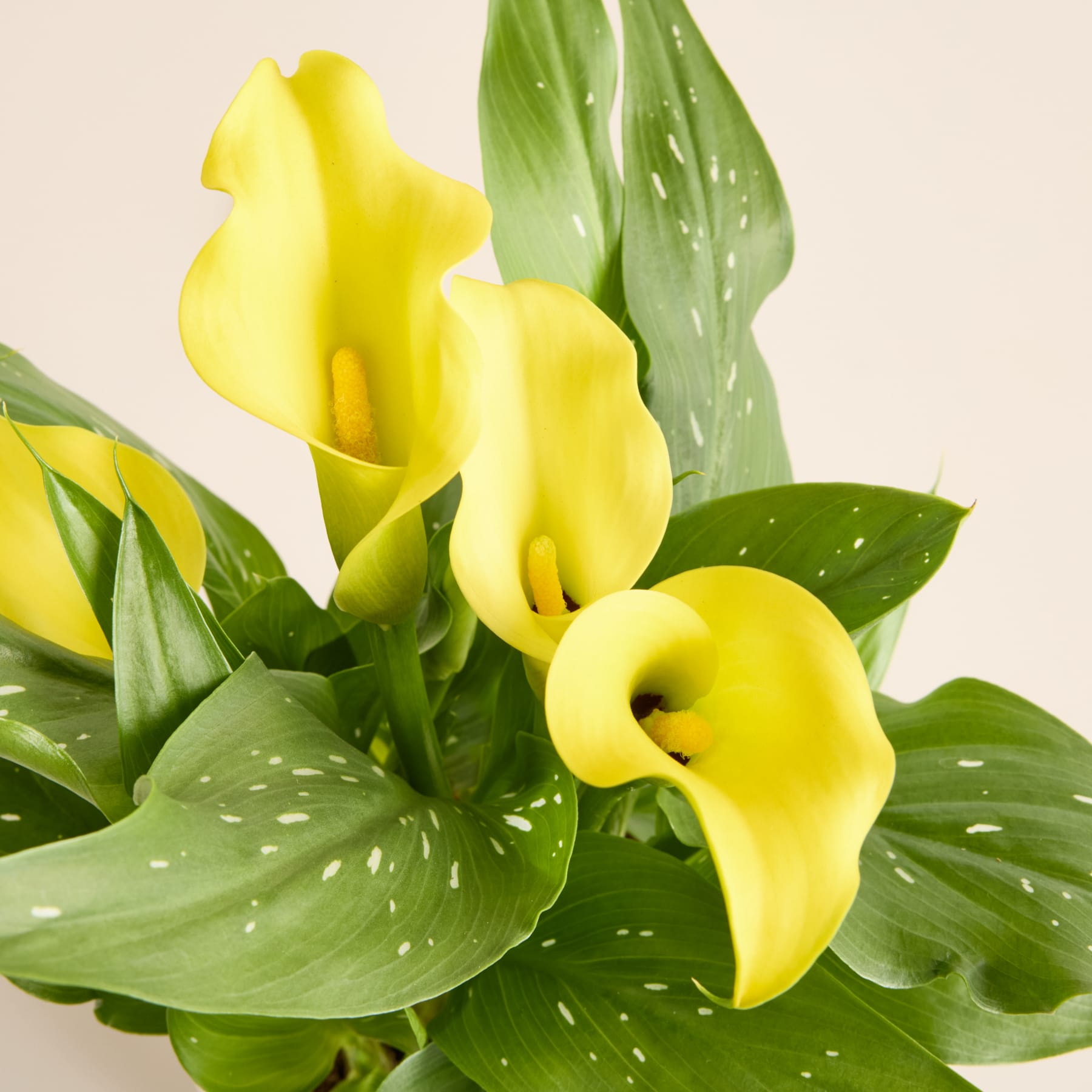 Wusstest du, dass die Calla für Reinheit und Sympathie steht? Zudem gilt sie als absoluter Glücksbringer. Was liegt da also näher als deine Lieben mit unserer gelb blühenden Calla Golden Glow zu überraschen? Sie hat eine Wuchshöhe von ca. 40 cm, die Topfgröße beträgt 12 cm. Und damit sie direkt an ihrem Bestimmungsort platziert werden kann, erreicht sie den Empfänger inklusive passendem Übertopf mit gelben Streifen und Ohren. Na, bist du überzeugt? Wir finden dieses Präsent einfach großartig. Beheimatet ist die Calla übrigens in den Sumpfwiesen Südafrikas. Gönne ihr einen halbschattigen, warmen Standort und eine hohe Luftfeuchtigkeit. Mäßige Wassergaben ein- bis zweimal pro Woche reichen aus.