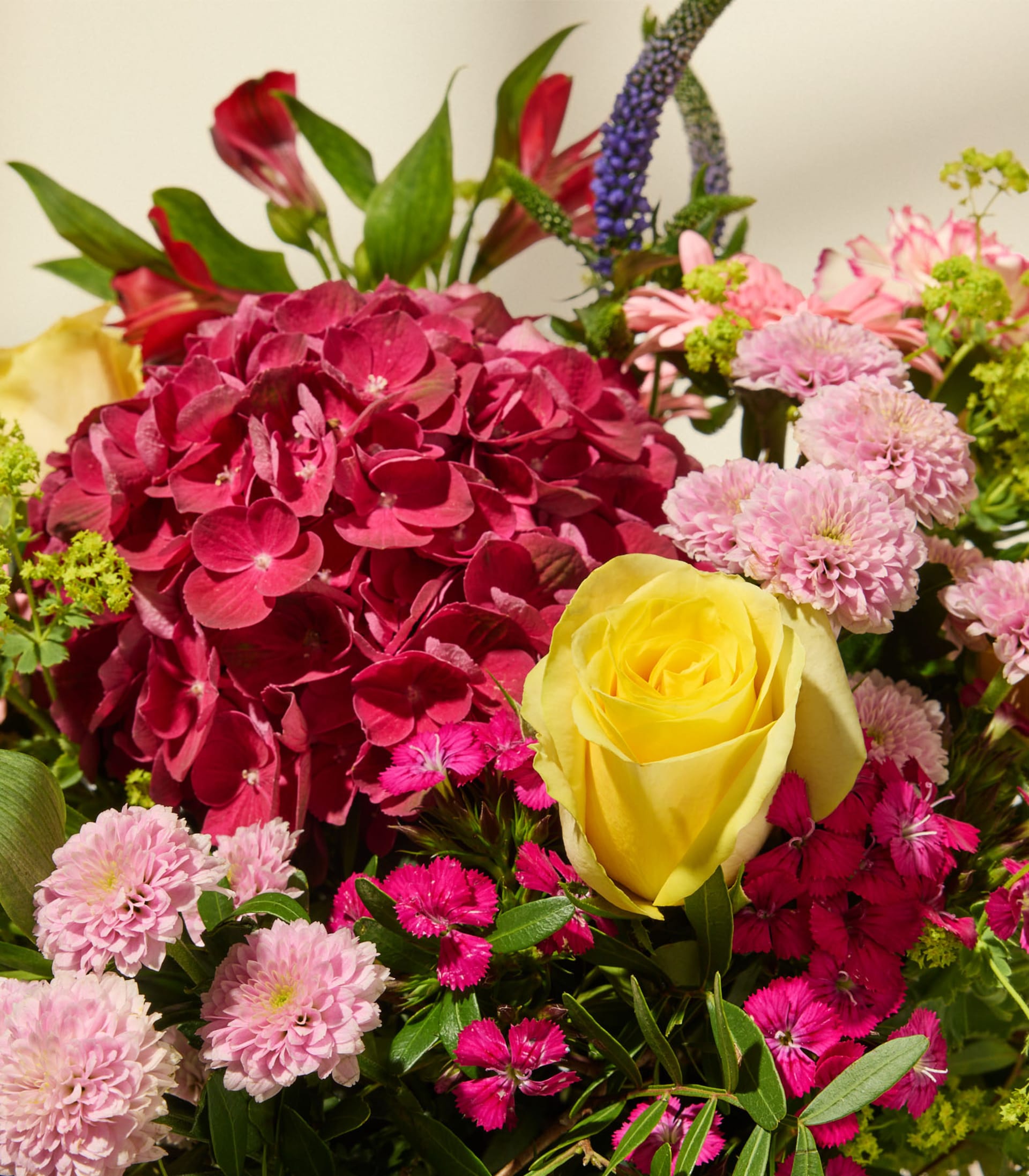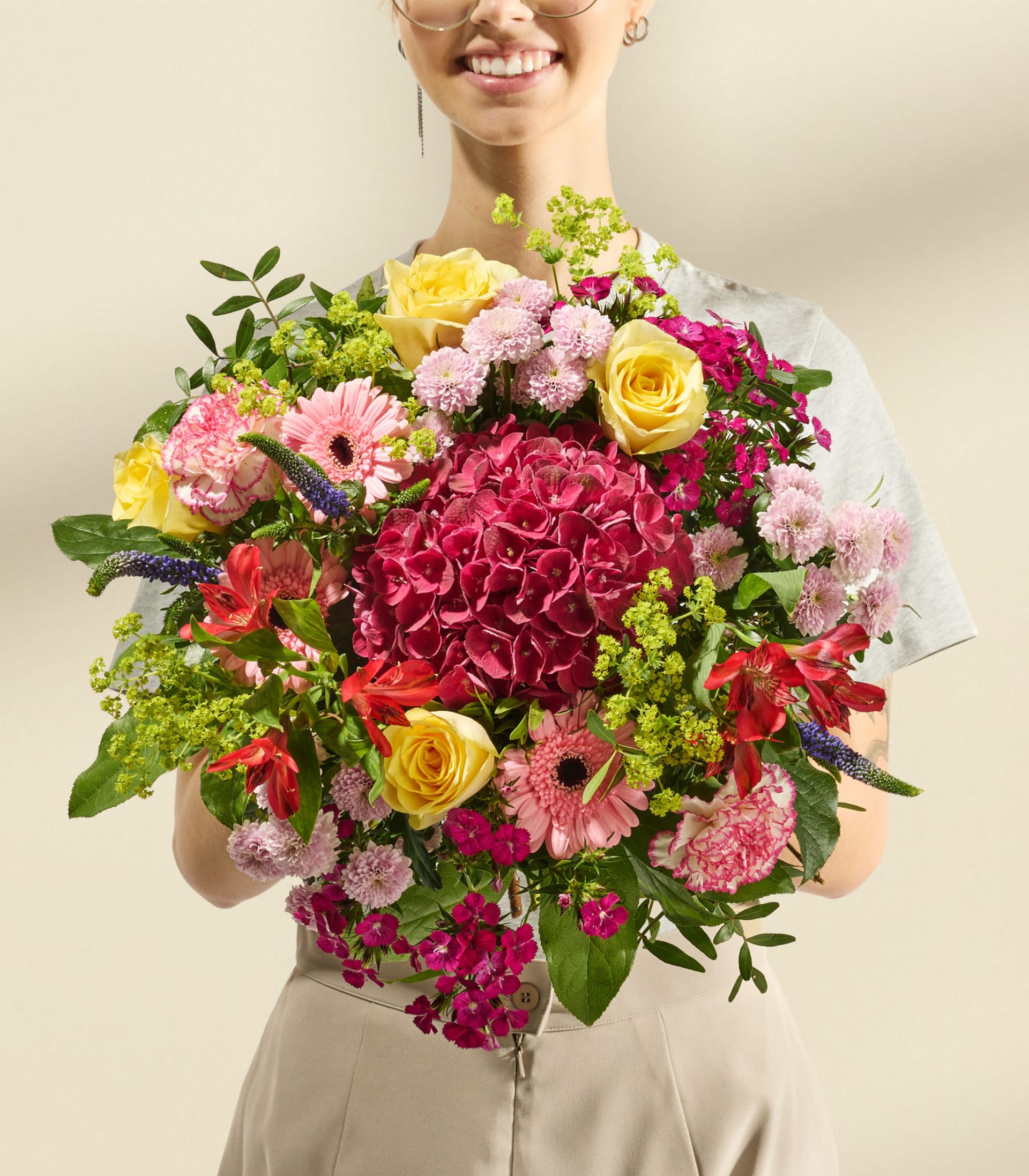 Ein wahres Blütenparadies erwartet dich mit diesem opulenten Strauß. Alstromerien, Nelken, Chrysanthemen, Gerbera, Hortensien und Rosen vereinen sich mit zartem Frauenmantel und Veronika zu einer üppigen, farbenfrohen Komposition. Die Vielfalt der Blüten macht diesen Strauß zu einem echten Hingucker und bringt die ganze Schönheit des Sommers zum Ausdruck. Perfekt als großzügiges Geschenk oder um sich selbst eine Freude zu machen. Die lebendigen Farben und die harmonische Anordnung schaffen eine warme, einladende Atmosphäre. Ein Bouquet, das Fülle, Lebensfreude und Natürlichkeit vereint.
