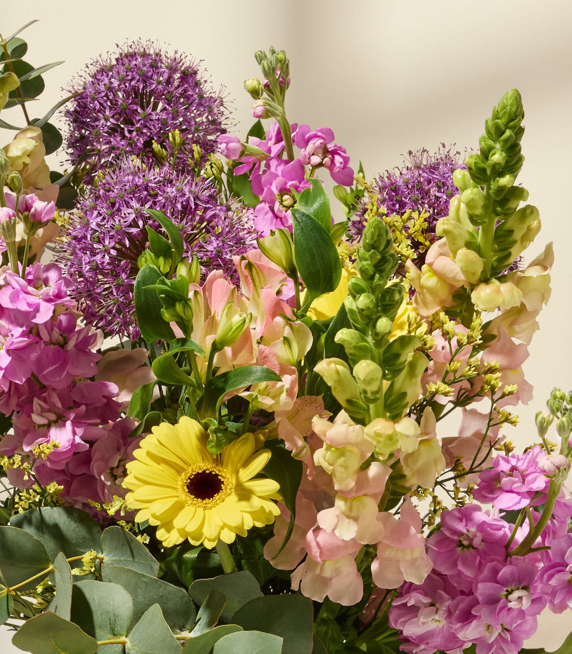 Sanft wie ein Sommermorgen präsentiert sich unser Wiesenblumenstrauß Pastelmix in zarten Rosé-, Lila- und Gelbtönen. Allium, Alstromerien, Löwenmaul, Levkojen und Gerbera werden von feinem Limonium und Eukalyptus begleitet. Die pastelligen Farben wirken beruhigend und gleichzeitig erfrischend – ideal, um ein liebevolles Geschenk zu überreichen. Dieser Strauß strahlt Leichtigkeit und Eleganz aus und passt perfekt zu entspannten Sommertagen. Die harmonische Kombination aus Blüten und Grün sorgt für ein ausgewogenes Gesamtbild. Ein floraler Gruß, der sanft berührt und lange Freude schenkt.